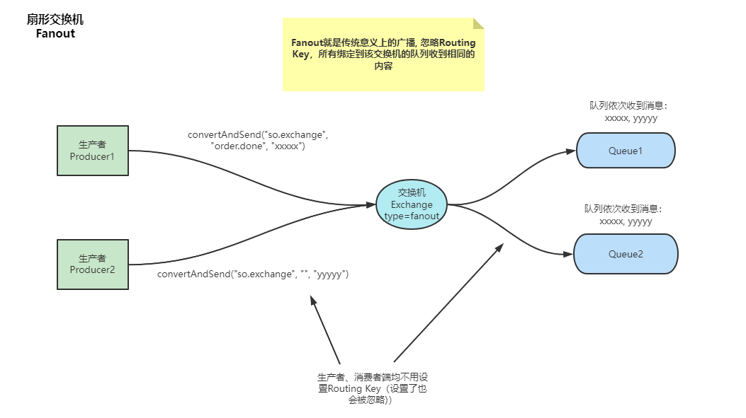 Fanout交换机,直译过来就是扇形交换机,他不关注任何路由键,只要发送到该交换机上的内容,会被发送到每一个绑定到该交换机的队列上,是一个典型的广播机制。