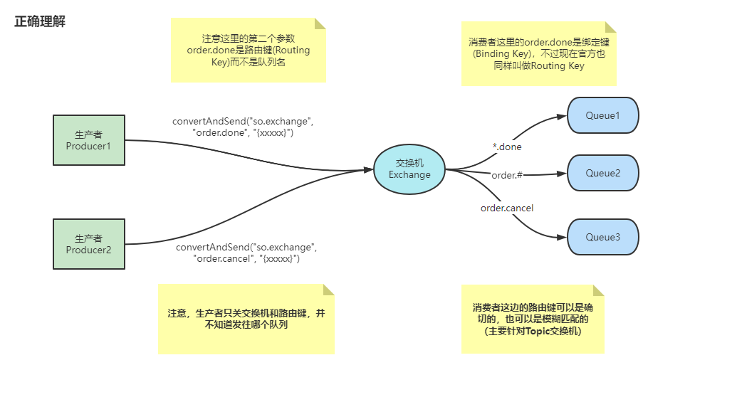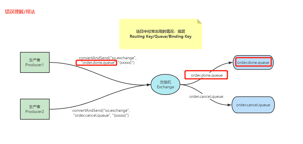 生产中使用问题:经常以为是发送给队列,而且会有convertAndSend(“exchange”, “xxx.xxx.queue”, data)这种用法,中间参数xxx.xxx.queue但其实该参数是表示的路由键Routing Key,并不是队列。