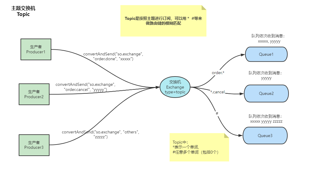 Topic顾名思义就是订阅主题相关,生产者方发送确切的Routing Key + 消息到交换机,消费者根据 确切/不确切的Routing Key来匹配路由